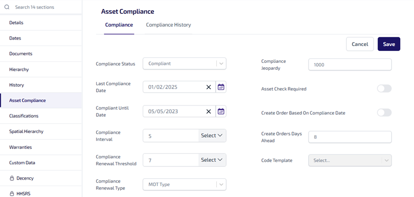 The Asset Details > Asset Compliance tab > Compliance sub-tab shows you the assets compliance details and is where you add and update the compliance information for the asset.