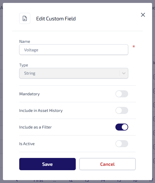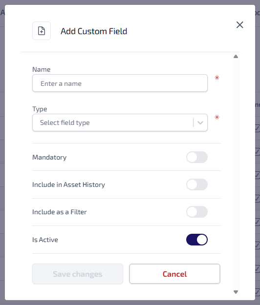 Select the toggle to indicate whether the asset custom field is Mandatory for Asset Details.
