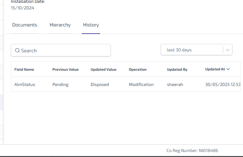 The Portfolio > Asset Register tab > select Asset > History tab in Asset Info shows you a history of any changes against the asset made in the Asset Details page, such as the assets status changing from ‘Pending’ to ‘Disposed’.