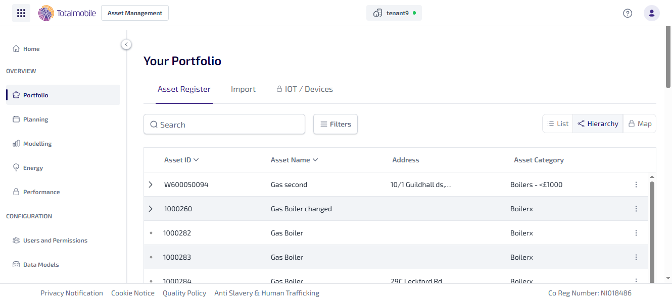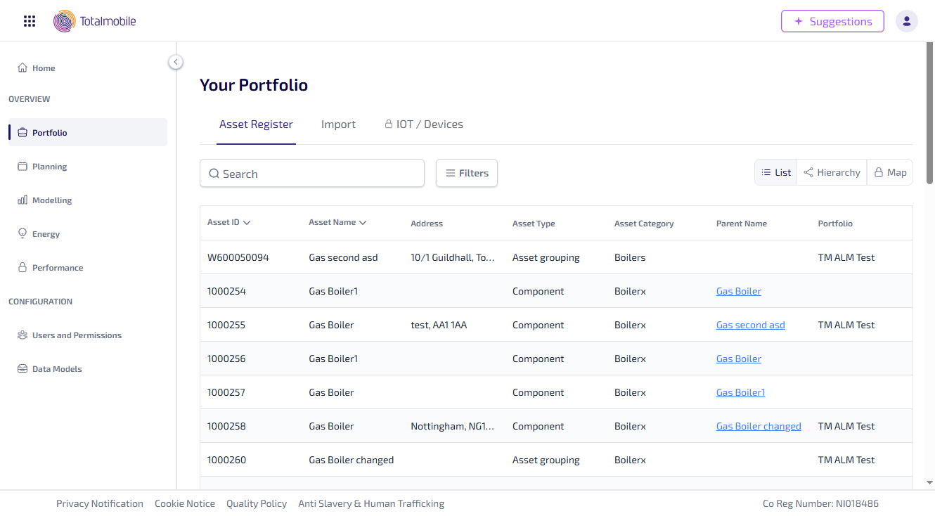 Select the Asset Register tab on the Portfolio page, by default the List view is shown, which has a table listing all the assets you maintain.