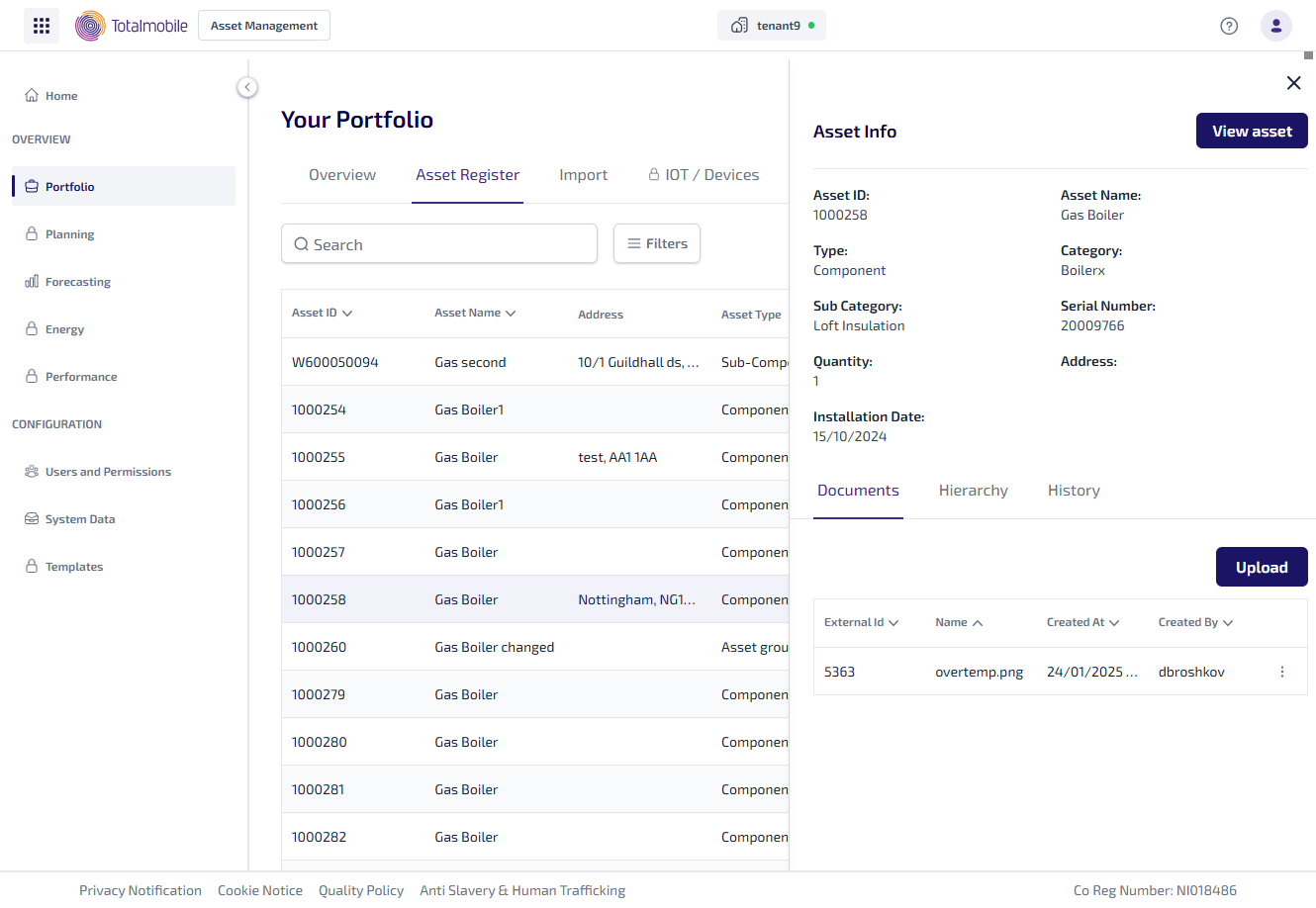 Select an asset in the Portfolio > Asset Register tab to open the Asset Info panel. The Asset Info panel opens to the right of the page and displays an overview of the asset details.