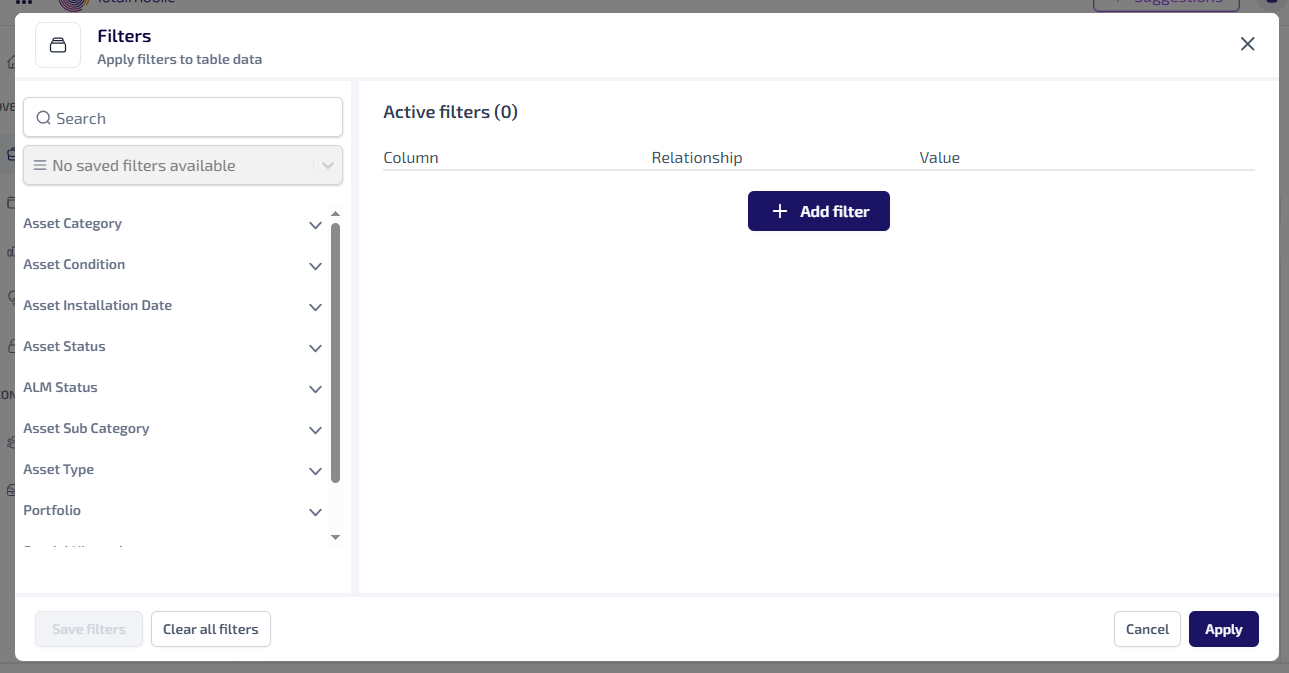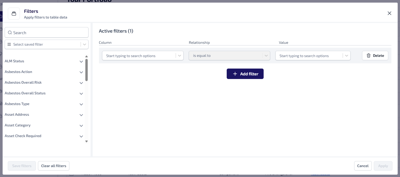 Filtering in the Asset Register lets you easily locate and narrow down assets based on various categories and criteria. Filters can be configured, applied and managed as needed.