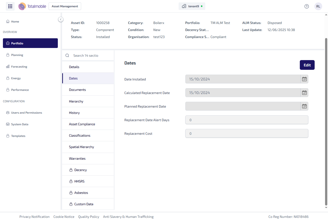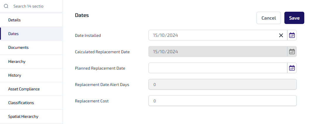 The Asset Details > Dates tab shows you the assets date information all in one place, and it is where you can edit the asset dates.