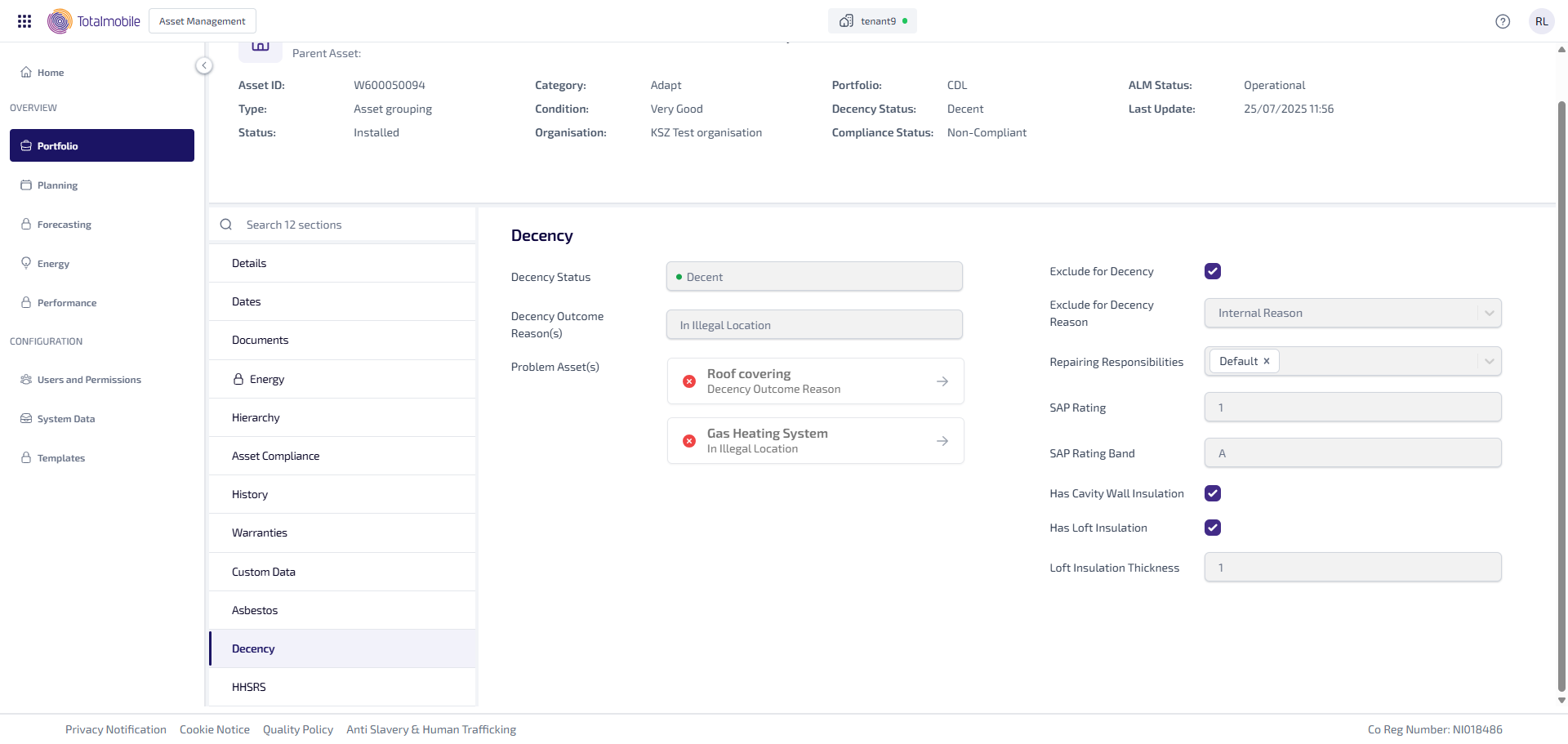 The Asset Details > Decency tab shows you up to date information from Job Management (Connect), about the condition of assets marked as a property.