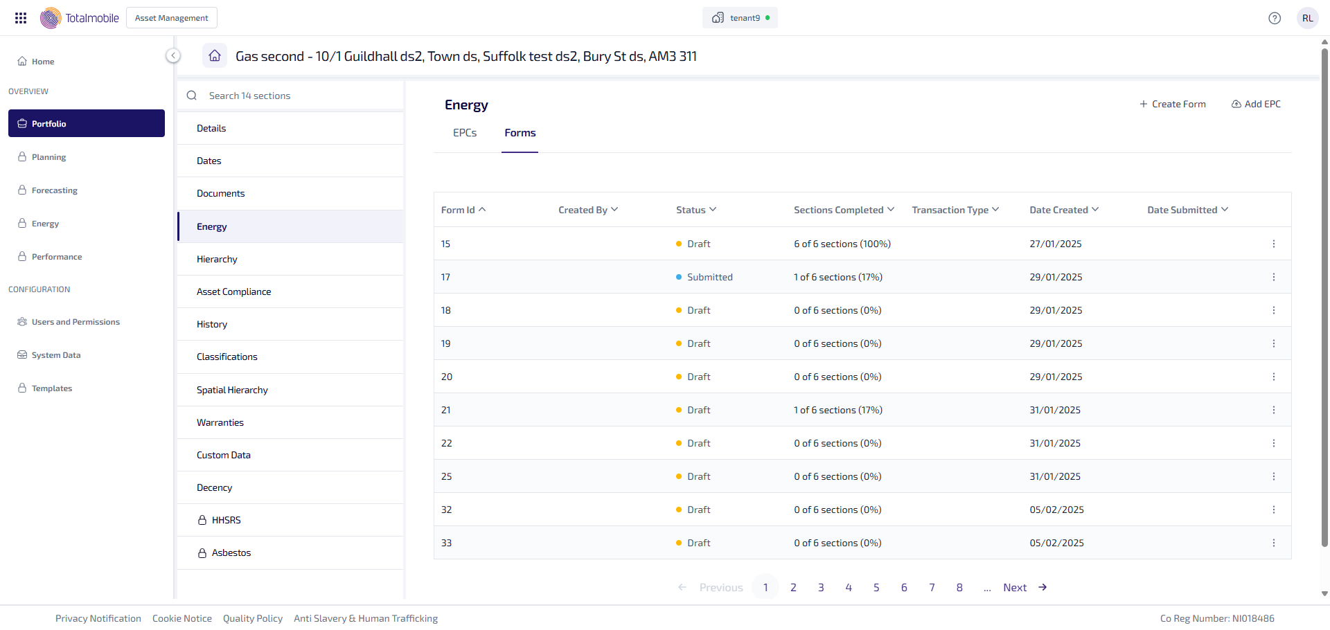 The Asset Details > Energy tab > Forms sub-tab shows you all the calculation forms for external assessments and provides you a way to manage the forms.
