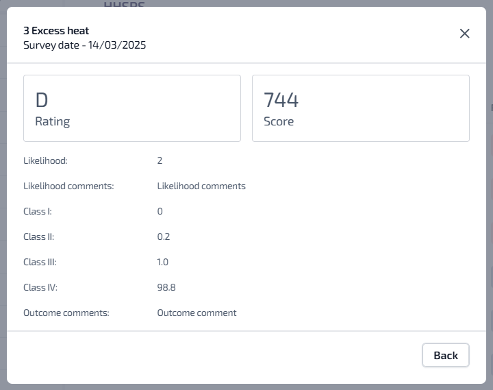 The HHSRS report dialog shows you the HHSRS hazard selected, along with the hazards number in the HHSRS hazard list, and the date the survey was carried out.