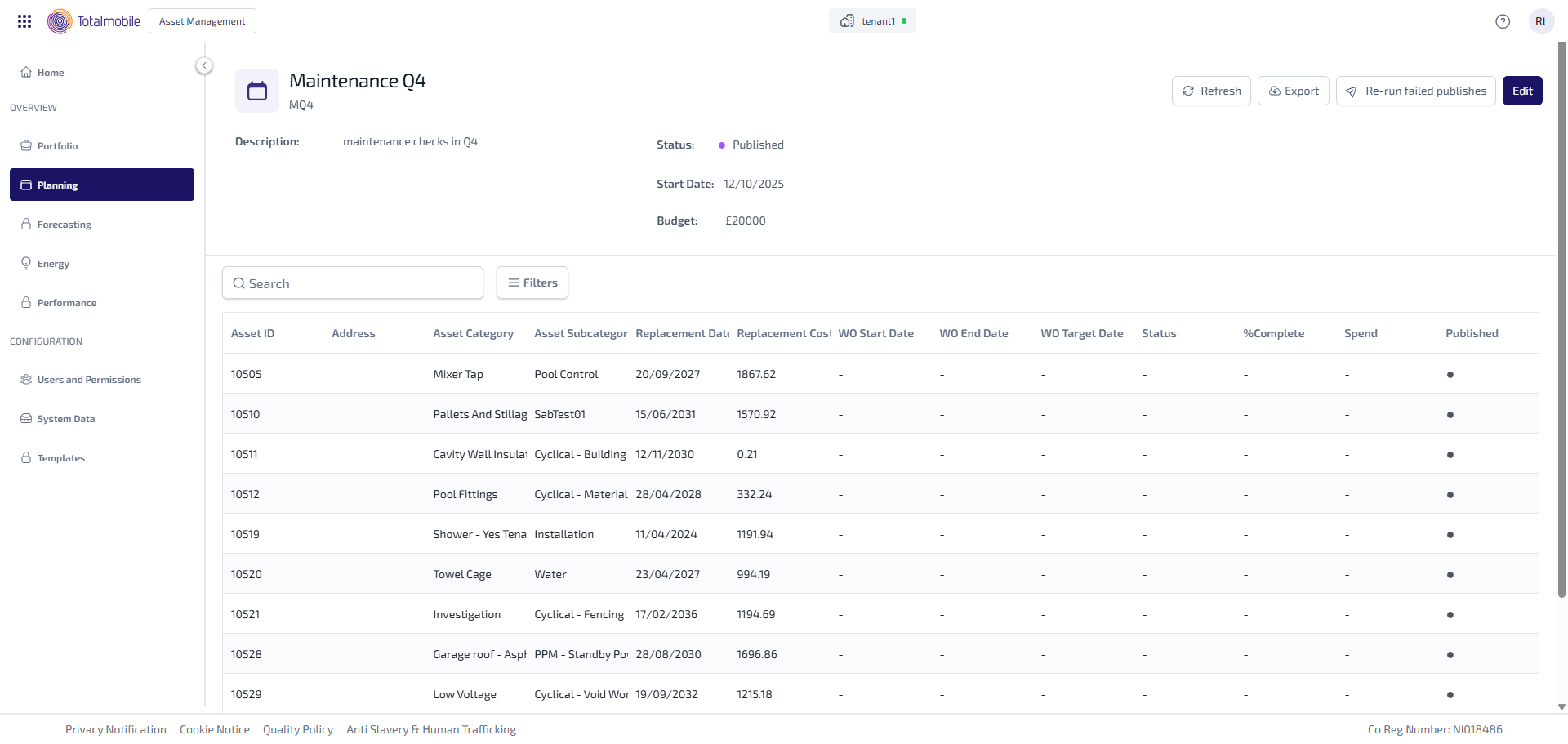 The Status updates to Published in the summary section, and the Published column appears in the asset table, showing whether the work order for each asset has been published to Job Management (Connect).