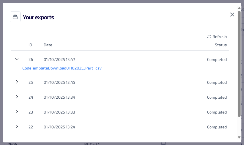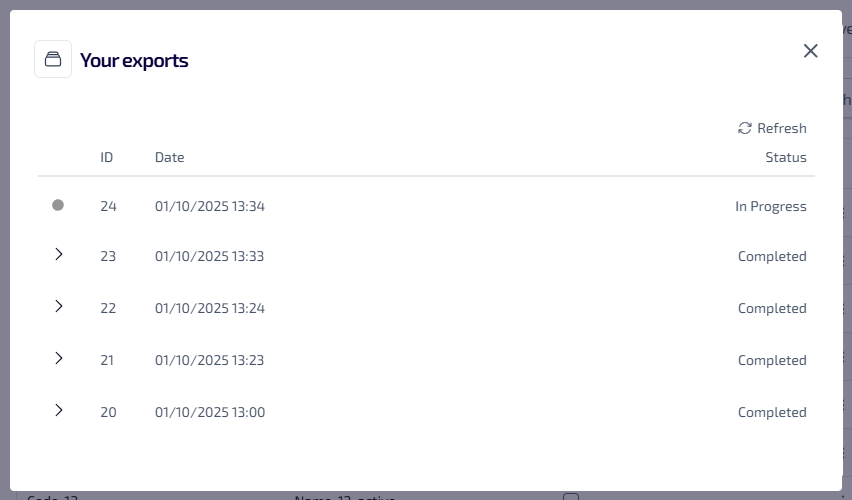This lists all of your exports which are in progress or completed. The following information is shown: