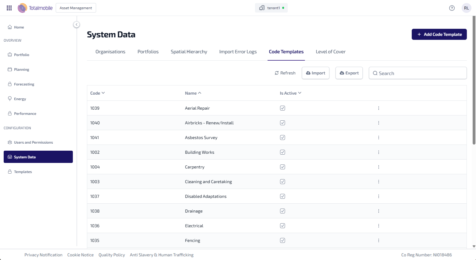 The code templates added should match those in Job Management (Connect), so when programmes are published in Overview > Planning, Job Management (Connect) knows which type of work order need to be created for the associated assets.