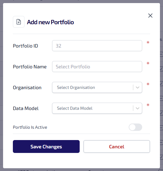 Portfolio ID* - The ID entered must be unique, can be alphanumeric, contain symbols and have a maximum 64 character limit.