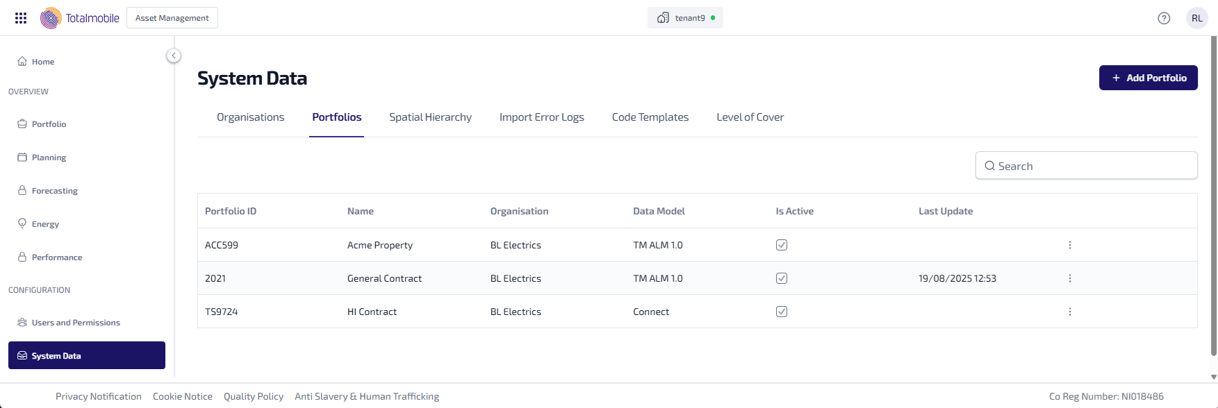 The System Data > Portfolios tab lets you add and manage the portfolios available for use with your assets.
