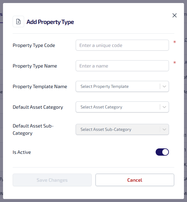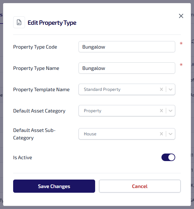 Is Active – indicating whether the property type is currently available to be assigned to assets marked as a property.