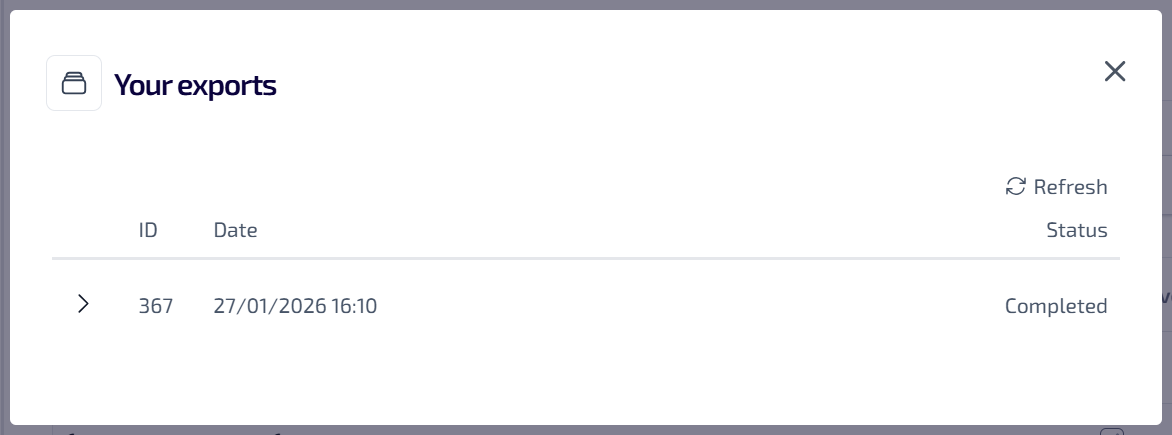 This lists all of your exports which are in progress or completed. The following information is shown: