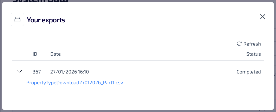 Export- select to export the property types as a .csv file.