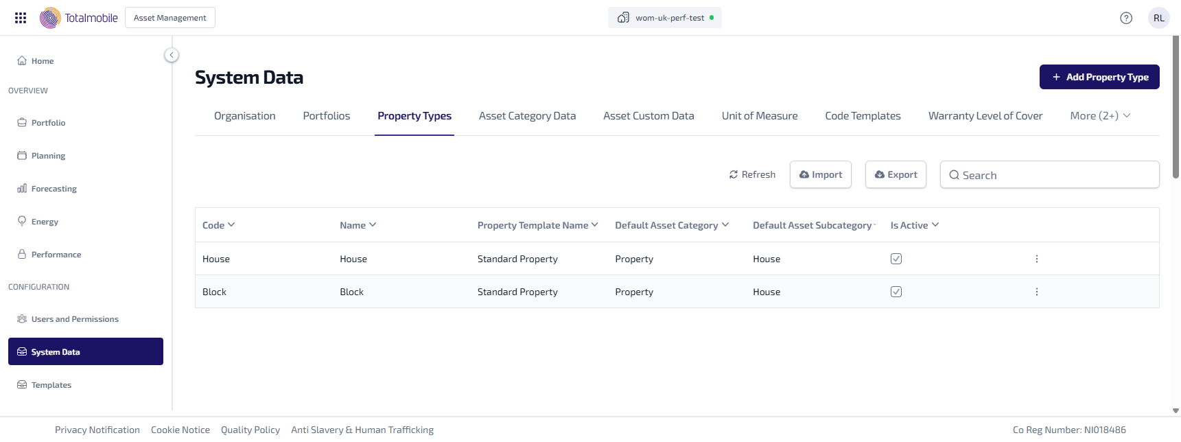 The System Data > Property Types tab lets you define and manage standard classifications of properties used in Asset Management.