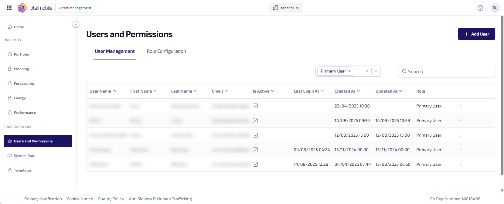 The User and Permissions > User Management tab is shown by default when you select the User and Permissions page. Here you can manage your existing users, and create new ones.