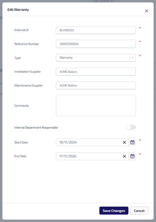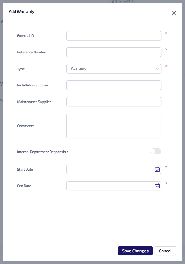 Select the Internal Department Responsible toggle to show whether an internal department is responsible for the warranty.