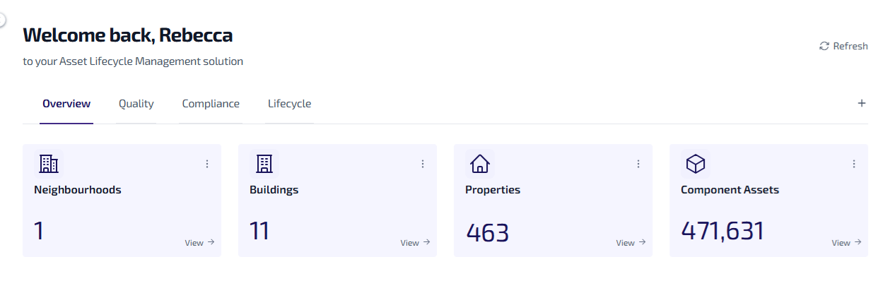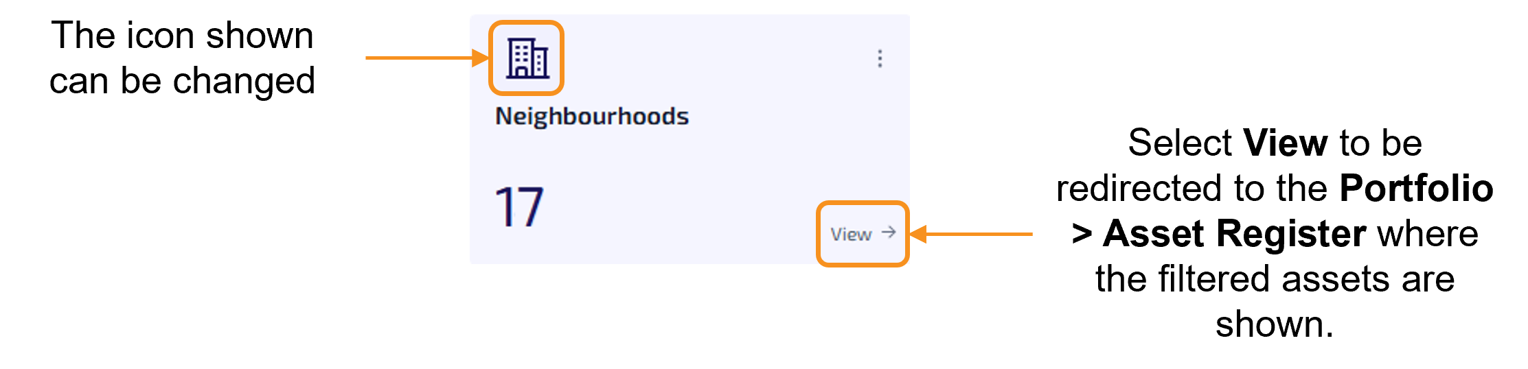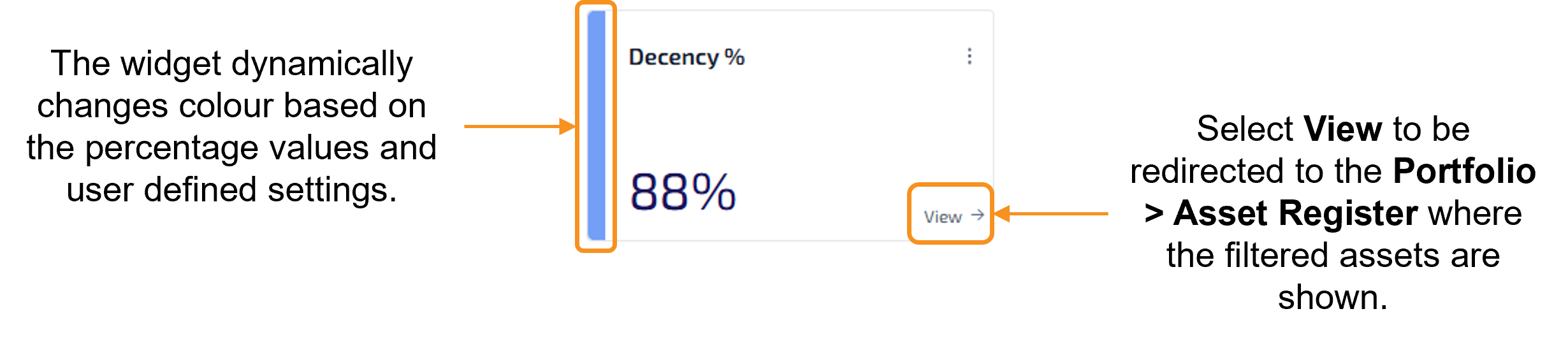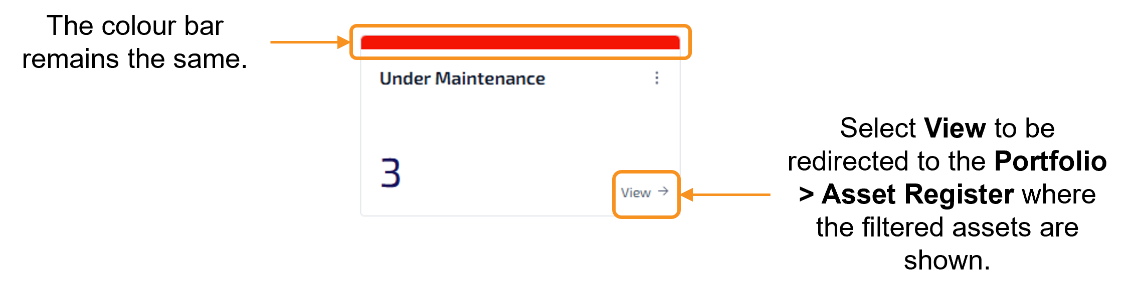The widget links to the Asset Register. Select View on the widget to be redirected to the Portfolio > Asset Register with a filtered asset list matching the filter applied to the widget.
