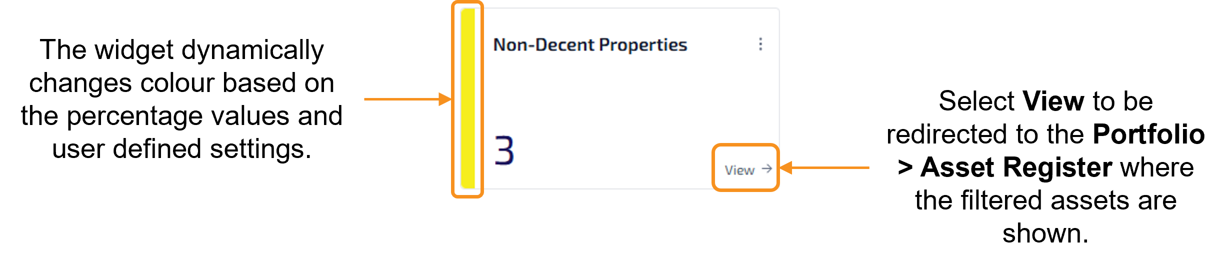 These show informational data with an additional colour change feature based on predefined conditions e.g. 3 Non-Decent Properties displaying an amber colour threshold.
