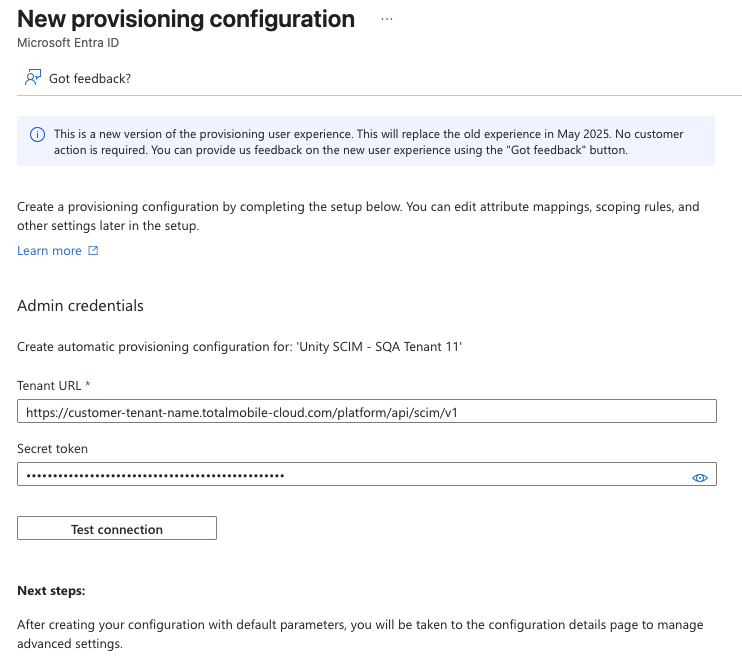 Select Test connection to verify Azure Entra is able to communicate successfully with the provided URL and token.