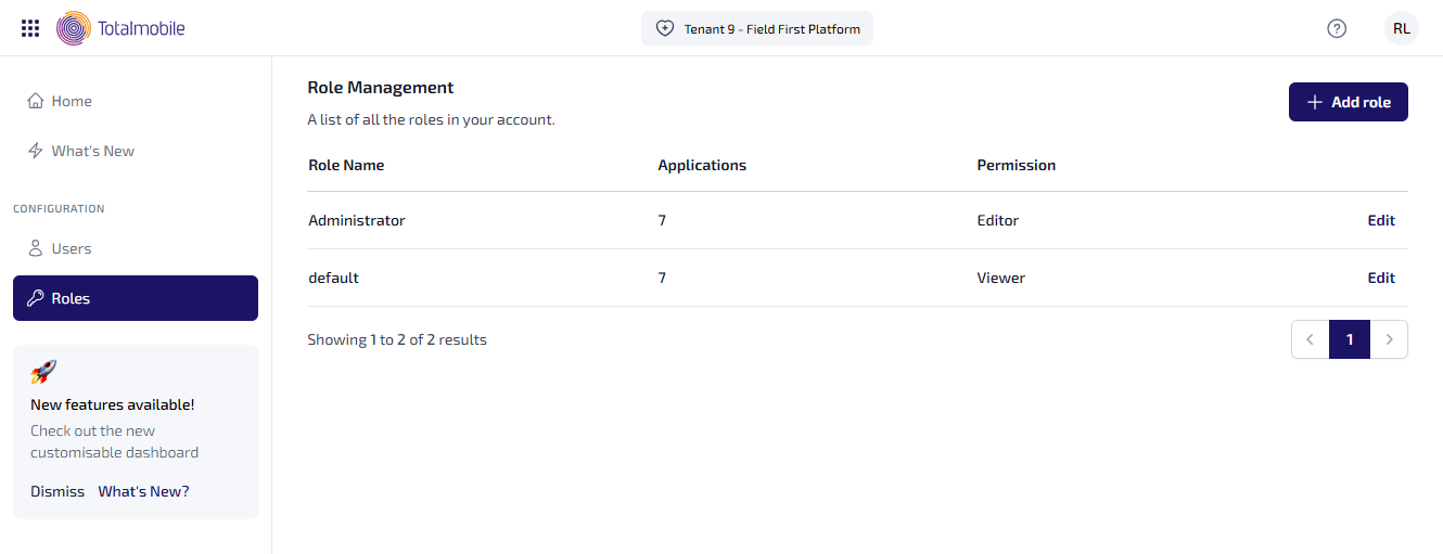 The Role Management page lists all the roles currently setup within Field First. For each role it shows you the:
