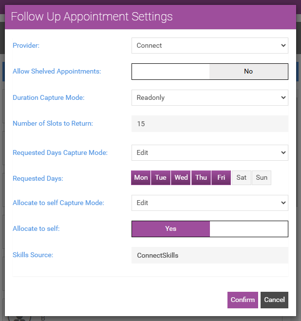 Allow Shelved Appointments - lets the user request a follow up appointment when there are no matching appointments to return. When set to Yes, it sends a request to the backend for someone else to arrange the follow up appointment. Select the field to toggle between Yes to turn it on, and No to turn it off.