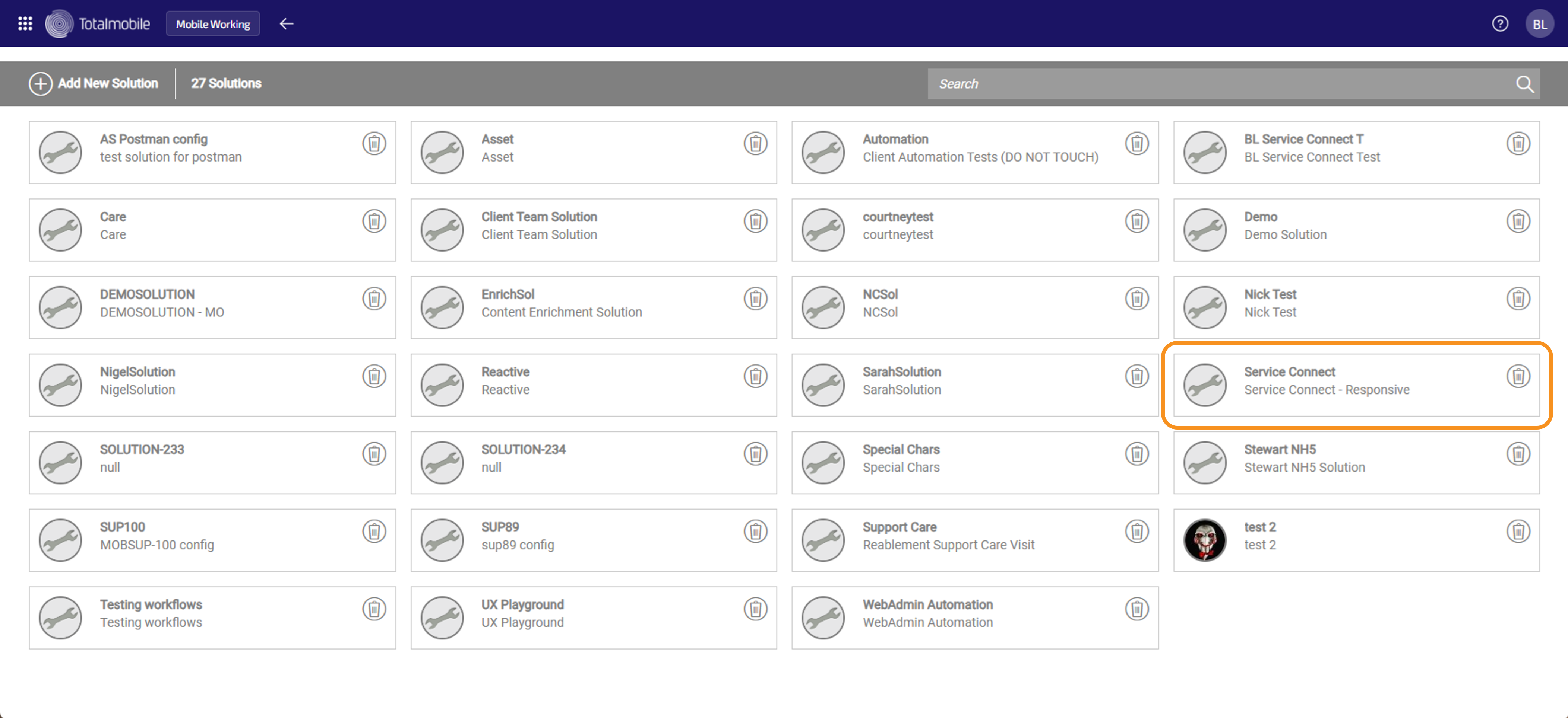 On the Solutions page select the relevant solution, which should be the solution set up to integrate with Connect.