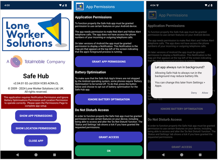 Due to recent changes in the Android operating system the app will now detect if the battery optimisation permission is required to be changed for the Safe Hub app. Upon starting the app after updating to version 2.04.01 the user will be presented with the permission screen. If the “ignore battery optimisation” button is blue the user will need to allow the app to always run in the background (see screenshots below). If the button is grey, it means the permission has already been set or is not required for the device. Please note that the app may present this option to the user in the future if the platform detects the requirement at a later date.