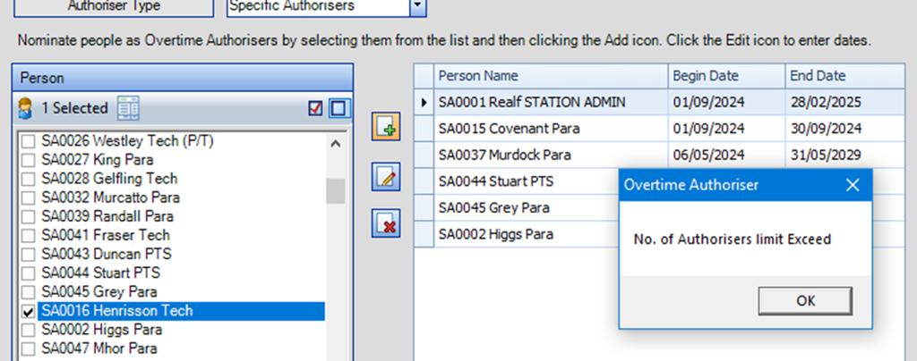 Users will be prevented from adding more than this number of people in the Overtime Authorisers 'Basic Rule' screen.