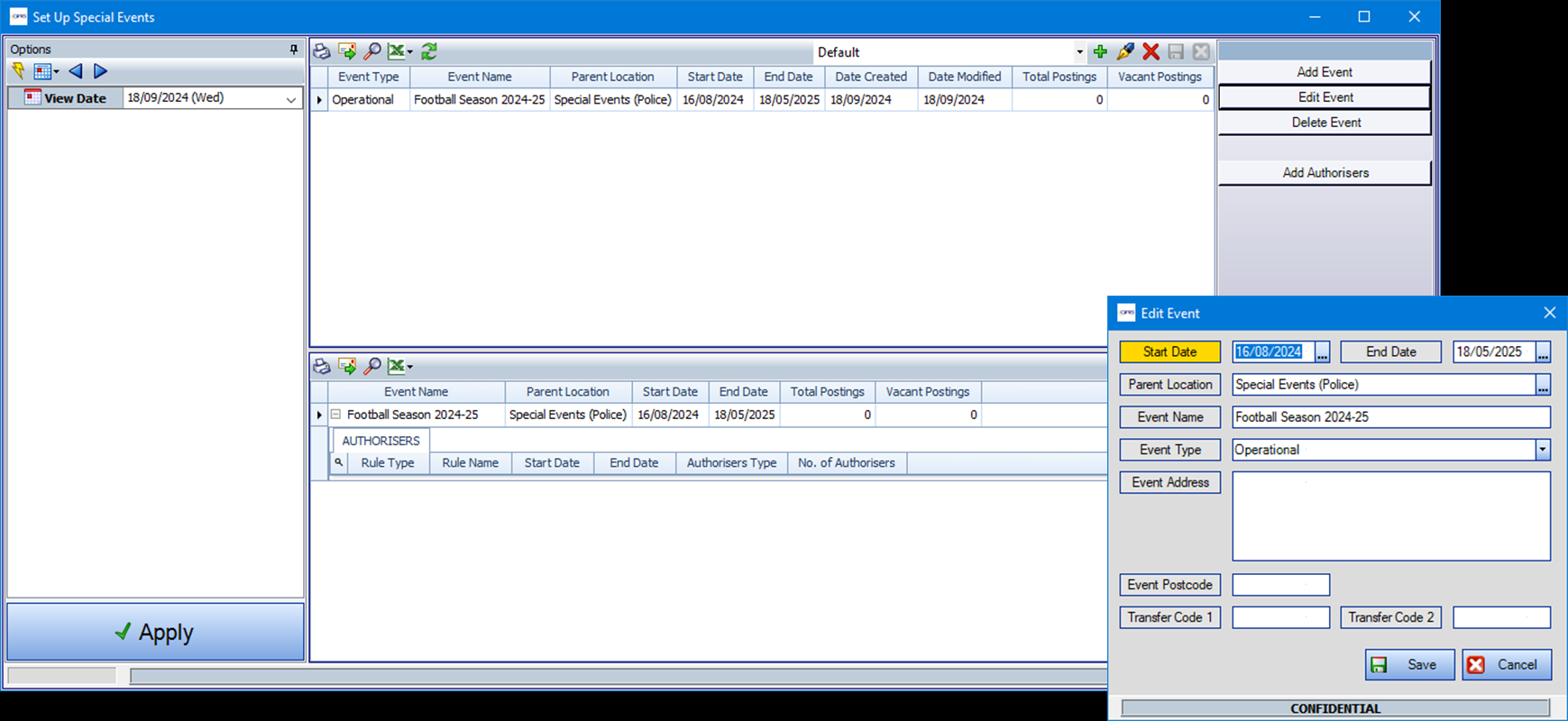 Main client: Set Up Special Events view of authorisers