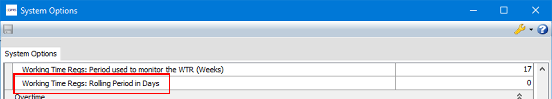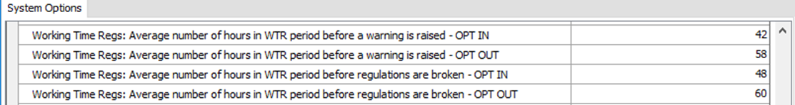 A new System Option has been added under the Rosters category called Working Time Regs: Rolling Period in Days. This can be set to any number between 0 and 99. This option controls the new WTR calculation method .