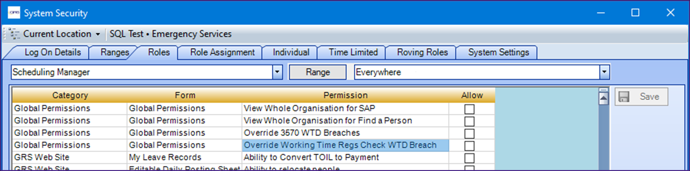 A new Special Permission is available (in Tools > System Security - Roles tab) which works with this Roster Alert: Override Working Time Regs Check WTD Breach. Users who have this special permission will have ability to override the Breach roster alert with the OK button. For users without the special permission, the OK button will be disabled to prevent the user from overriding the breach.