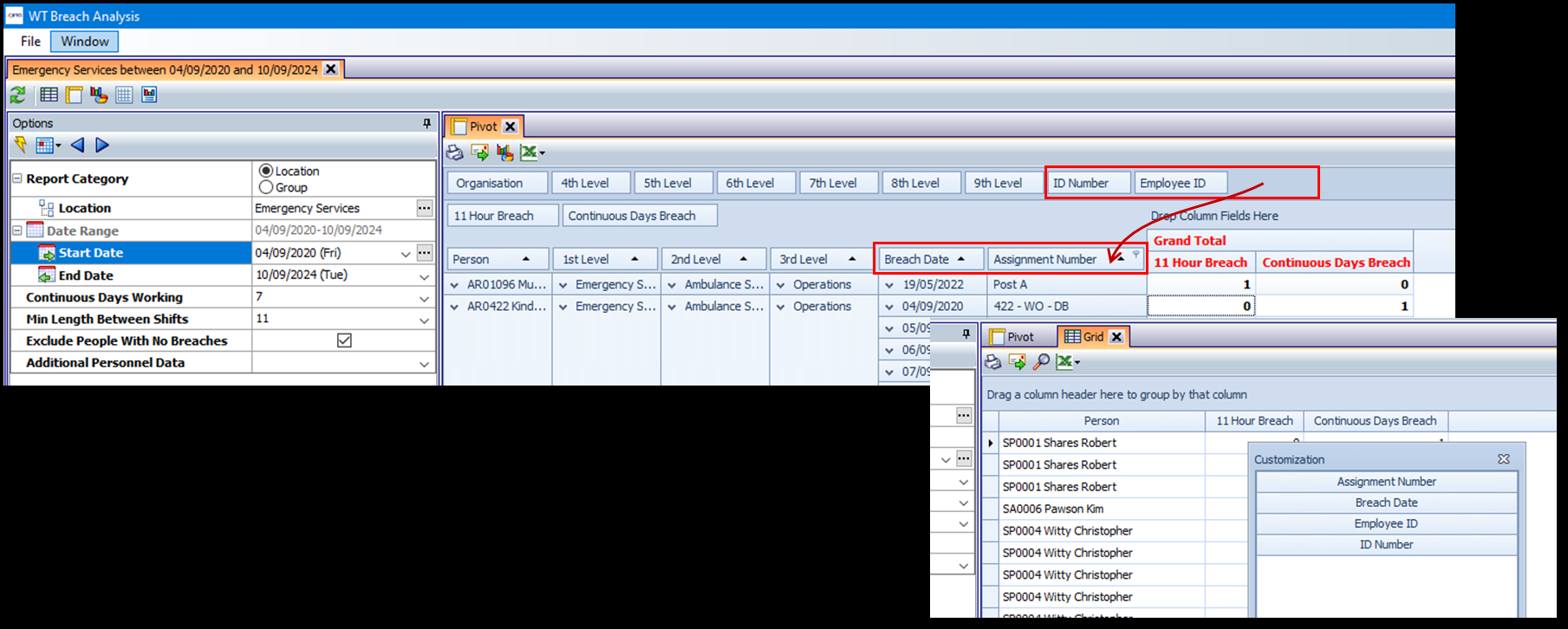 New columns have been added to the WT Breach Analysis. The columns are available to add to the report from the unused columns area on the Pivot View (top of the screen) and in the column chooser on the Grid View (right click on header).