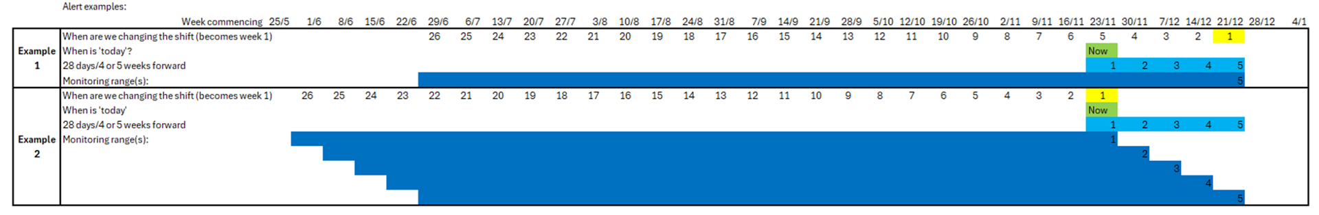 Example 2: If the shift change date is within the first week of the 28-day period then five calculations will be provided. Only four calculation weeks will be used if the current date is a Monday.