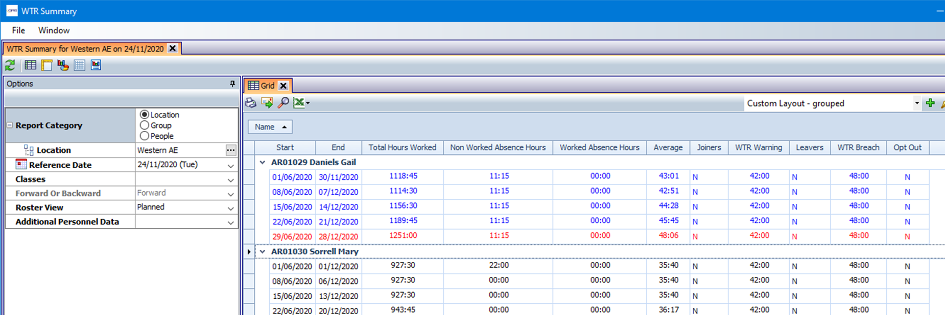 WTR Summary view. The report in this image has been changed from the default by the operator to use a custom layout that groups the data by person. End users with the screen permission can also do this as part of standard GRS report functionality.