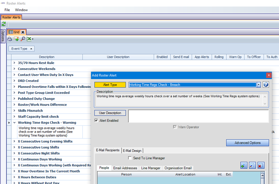 The single previously existing Roster Alert ‘Working Time Regs Check’ has been replaced by two alerts: