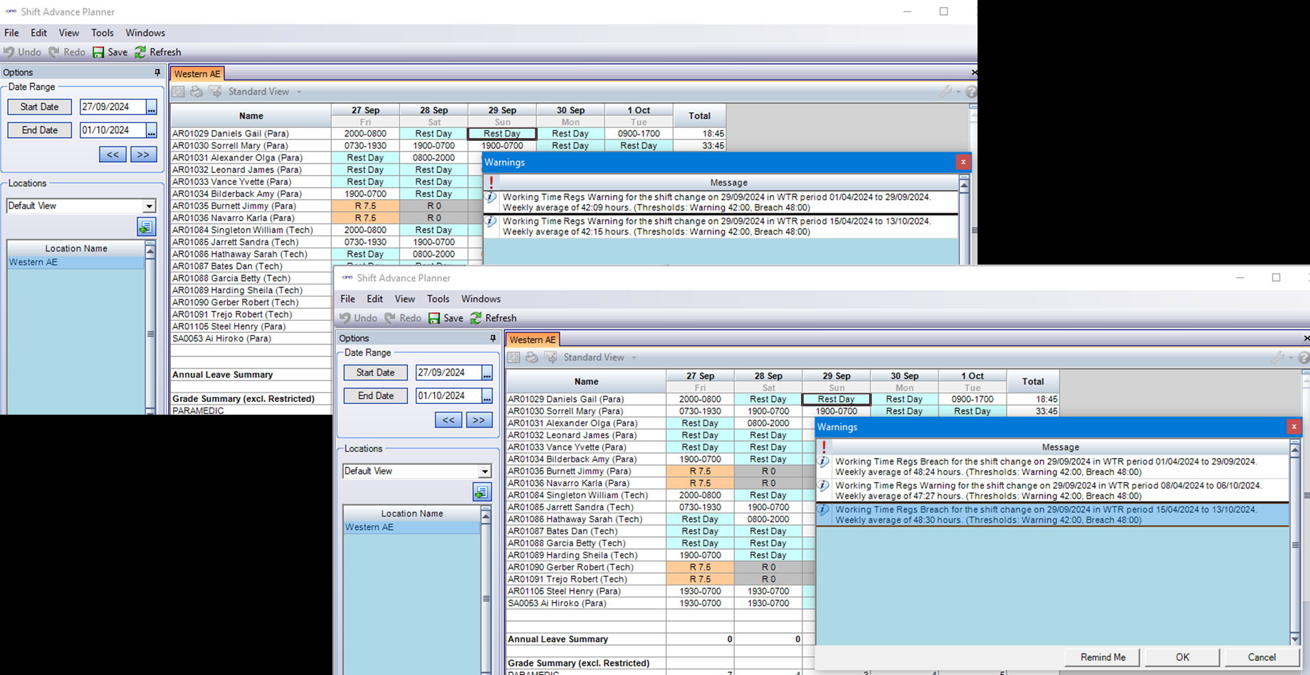 Alerts only show for shift changes on dates within the Rolling Period (e.g., 28 days); this means no alerts show for shift changes on past dates. The WTR Individual and Summary reports can be used to see information on past periods.