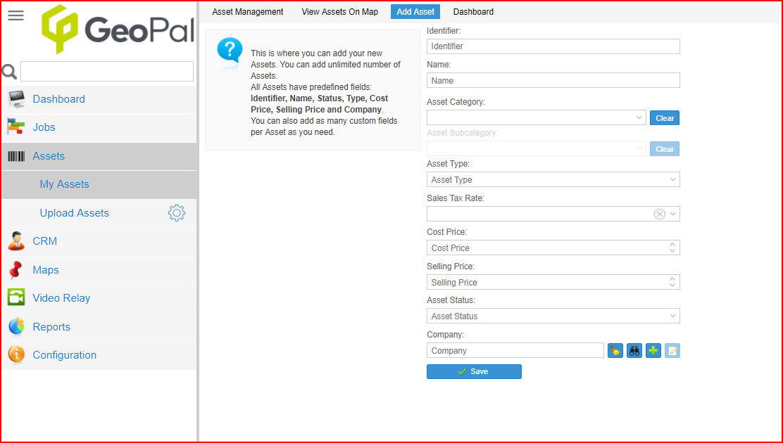 Once you have configured your Asset management section you can then begin to add your assets. To do this go to ‘Assets’ in the GeoPal Menu. You can add the Assets manually as per the screen shot below.