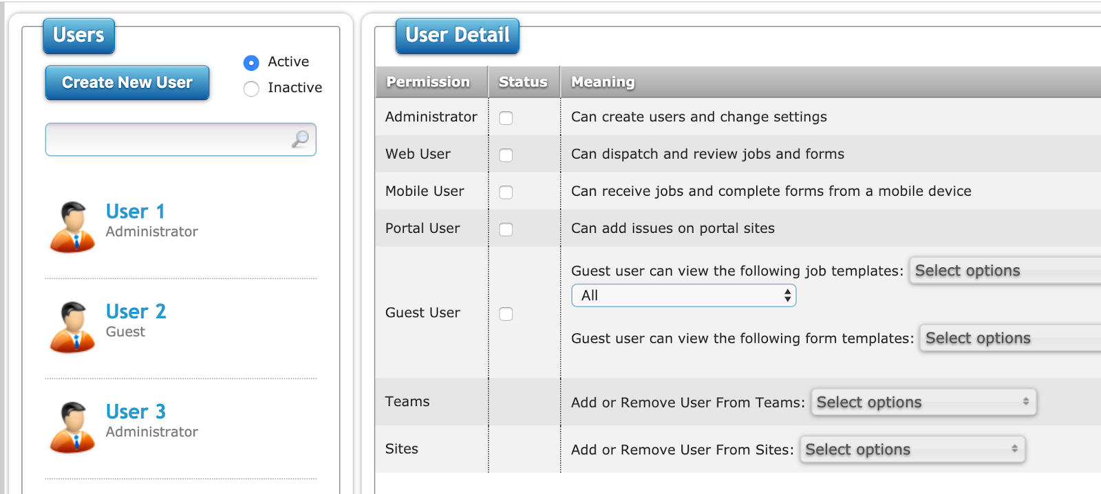 On the left-hand side is the list of all current users and this is also searchable. You can also sort by Active and Inactive users. Active will be selected by default.